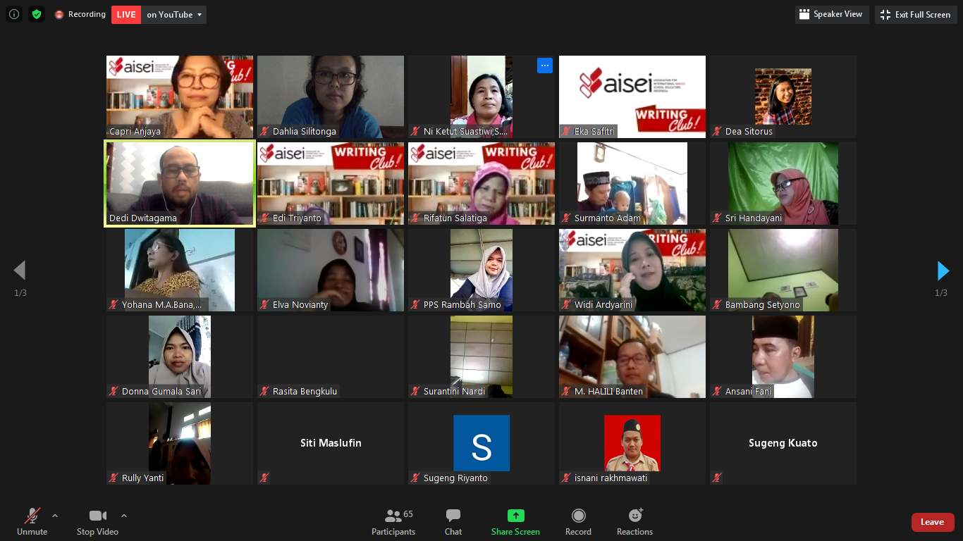 Hari ini, komunitas penulis AISEI mengadakan webinar online ke-7 bersama Om Jay dan pak Dedi Dwitagama. Pendahuluan dibuka terlebih dahulu dengan perkenalan oleh Bu Capri dan Bu Dea. Hari ini tidak ditampilkan materi presentasi. Pembicara menyampaikan materi webinar dengan bercerita menulis peristiwa melalui pengalaman hidupnya. Dengan menulis, beliau memiliki pengalaman menjadi pembicara ke seluruh nusantara. Konsistensi penulisan adalah hal yang sangat penting.
